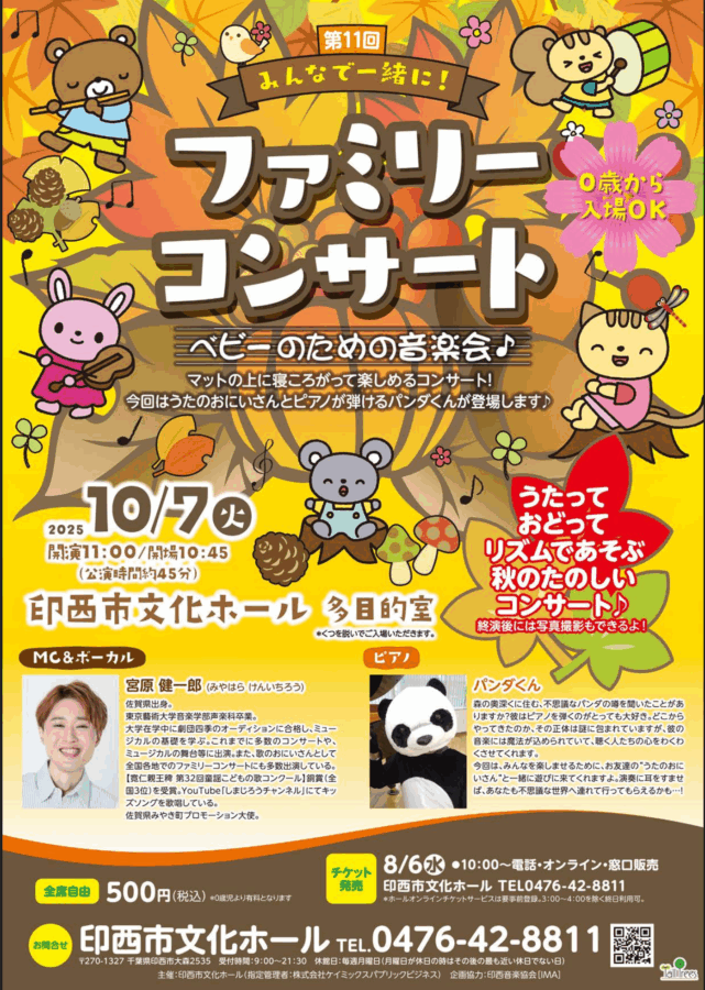 10月7日、11時00分から印西市文化ホール多目的室にて「第11回みんなで一緒に!ファミリーコンサート」が催されます。